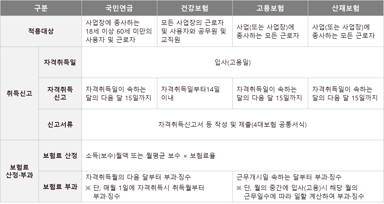 보험료부과 | 자격취득일이 속하는 달의 다음달 15일까지 | 자격취득일부터 14일 이내 | 자격취득일이 속하는 달의 다음달 15일까지 |
