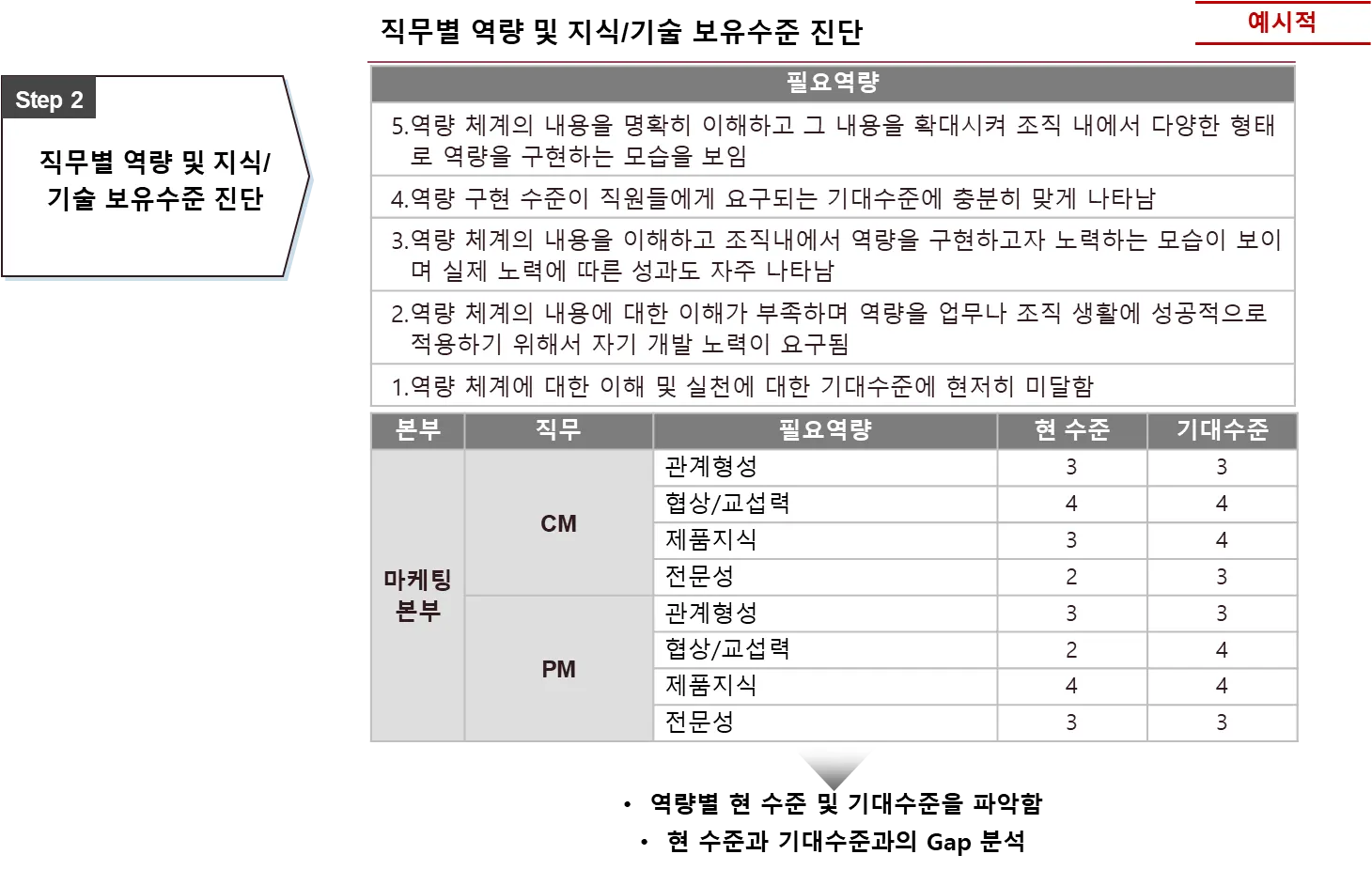 직무별로 확정된 역량, 지식/기술에 대해 현 수준 및 기대수준을 파악 합니다.