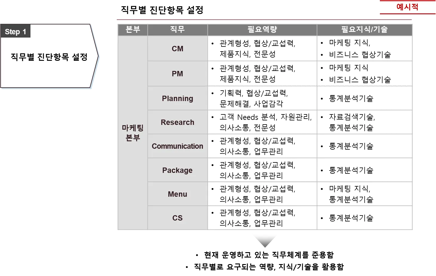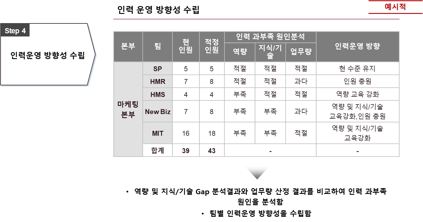 구성원의 역량 및 지식/기술 보유 수준을 고려하여 필요 인력 규모 및 인력운영 방향성을 수립하여 적정인원을 산정 합니다.