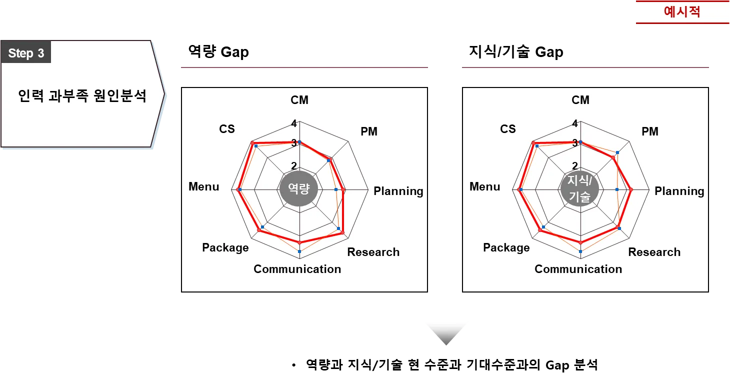 직무별 역량 및 지식/기술의 현 수준과 기대수준과의 Gap 분석을 통해 인력 과부족 원인을 분석 합니다.