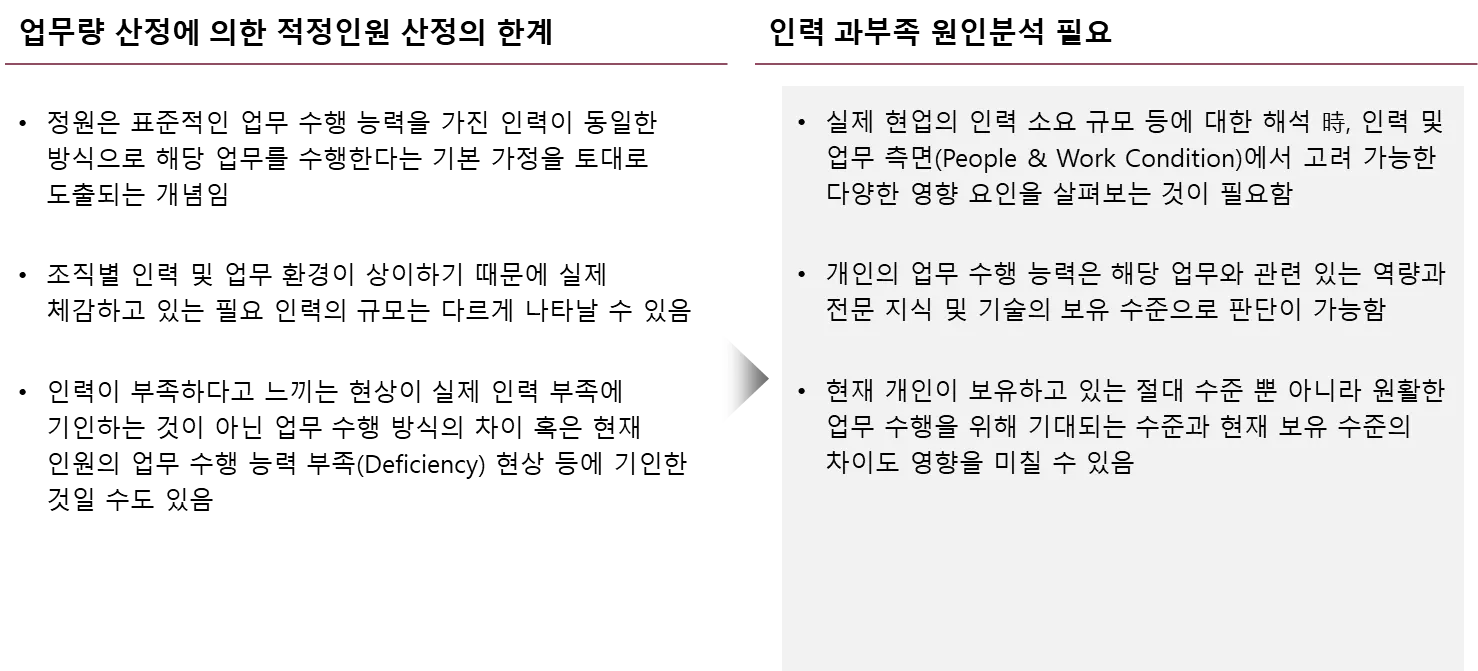 업무량 산정 및 인력 과부족 원인 분석을 통해 인력 운영방향성을 수립 합니다.