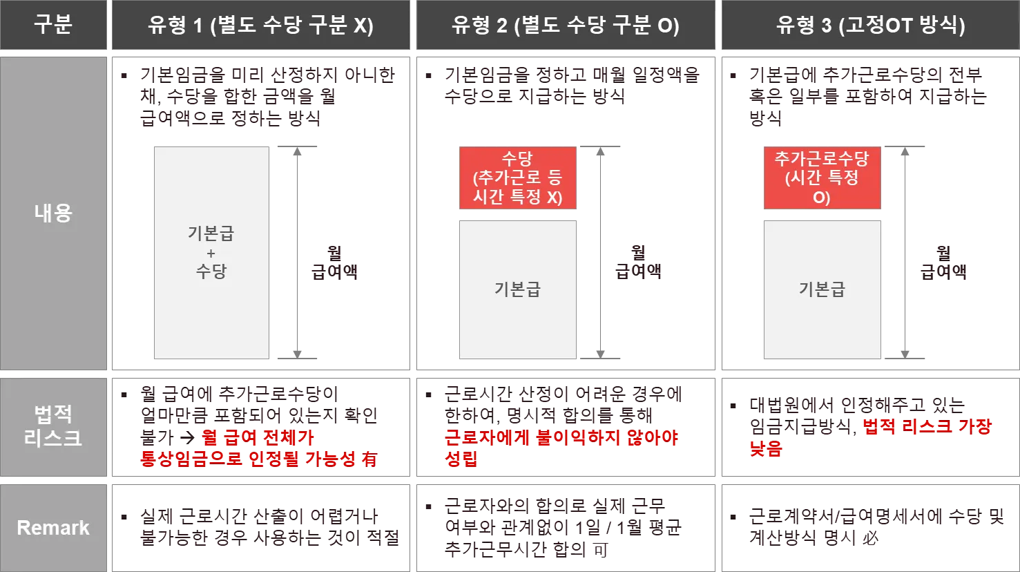 •실제 연장근로 여부와 관계없이 월 32시간 연장 · 야간 근로시간 간주의 대가로서 고정OT 지급  | •매 월 모든 근로자에게 연장근로시간을 고려하지 않고 고정OT수당 지급 / 평일 연장근로수당 산정 시 고정OT수당으로 지급된 금액 차감