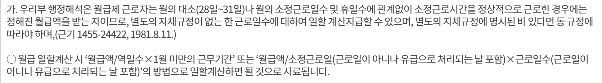 월급제 근로자는 월의 대소(28일 ~ 31일)나 월의 소정근로일수 및 휴일 수에 관계없이 소정근로시간을 정상적으로 근로한 경우에는 정해진 월급액을 받는 자이므로, 별도의 자체규정이 없는 한 근로일수에 대하여 일할 계산할 수 있음 (노동부 행정해석, 근기 1455-24422 참조)