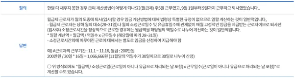* 월급액 : 2,400,000 | (2,400,000원 ÷ 31일) × 16일 = 1,280,000원 | (2,400,000원 ÷ 26일) × 14일 = 1,292,308 | (2,400,000원 ÷ 209시간) × 8시간 × 14일 = 1,286,124원 | (2,400,000원 ÷ 30.4일) × 16일 = 1,263,158원 |