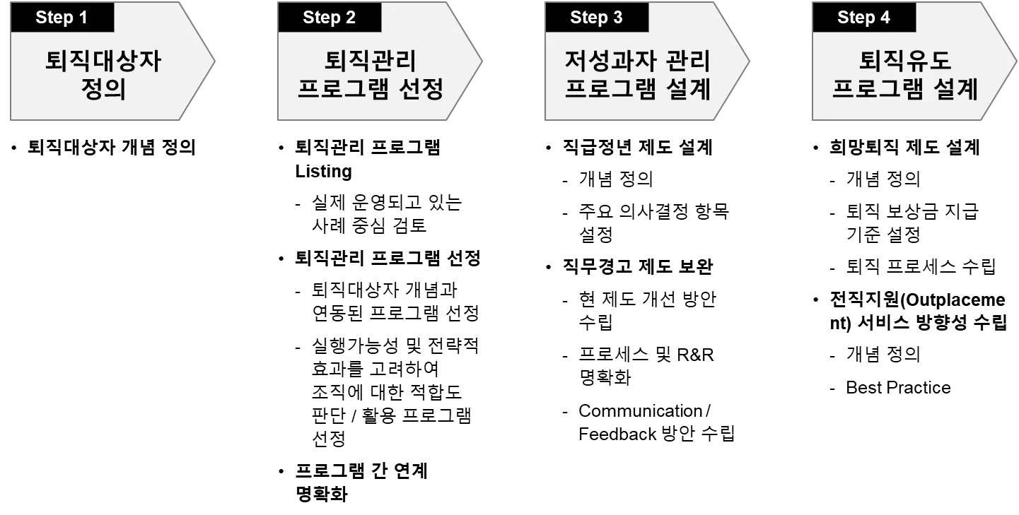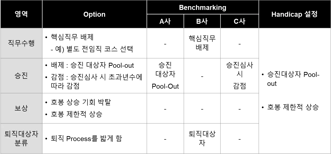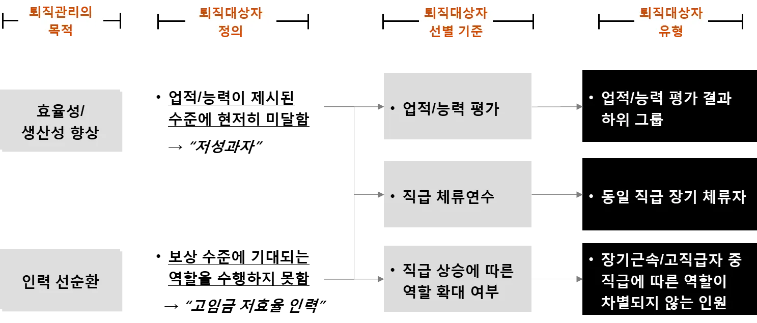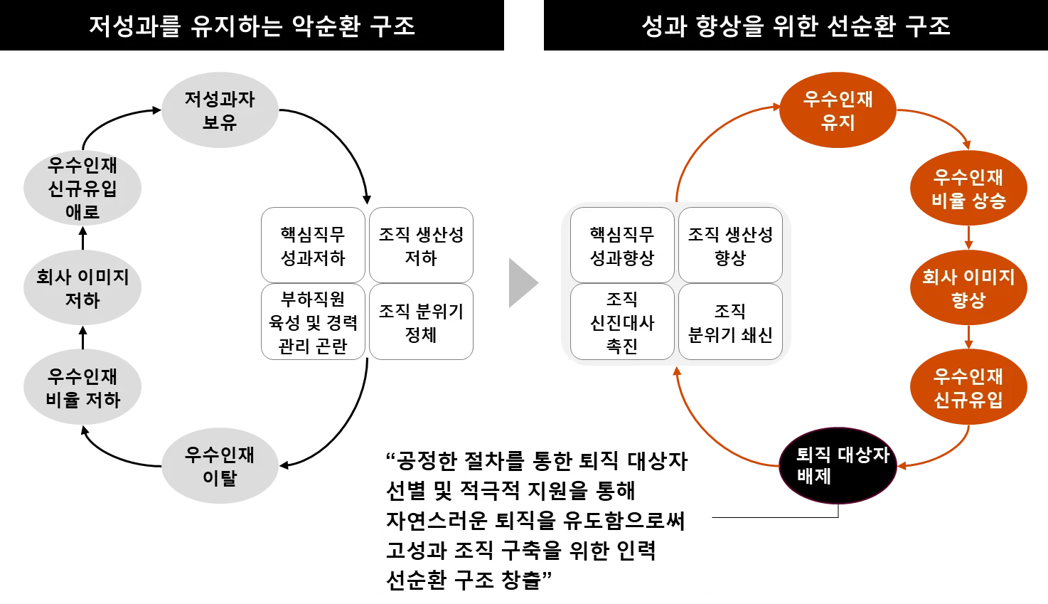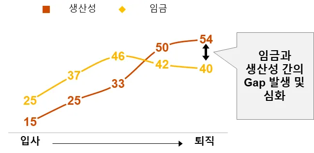 단순히 해당 인력들의 퇴사 유도가 아닌 고용 안정성과 성과주의의 결합을 통해 높은 역량을 보유하고 있는 고 연차자 근로자를 활용하여 조직의 성장을 더욱 가속화 할 수 있는 기반을 마련함