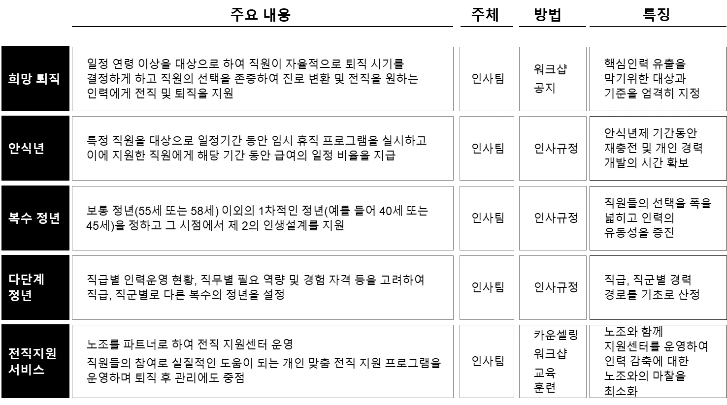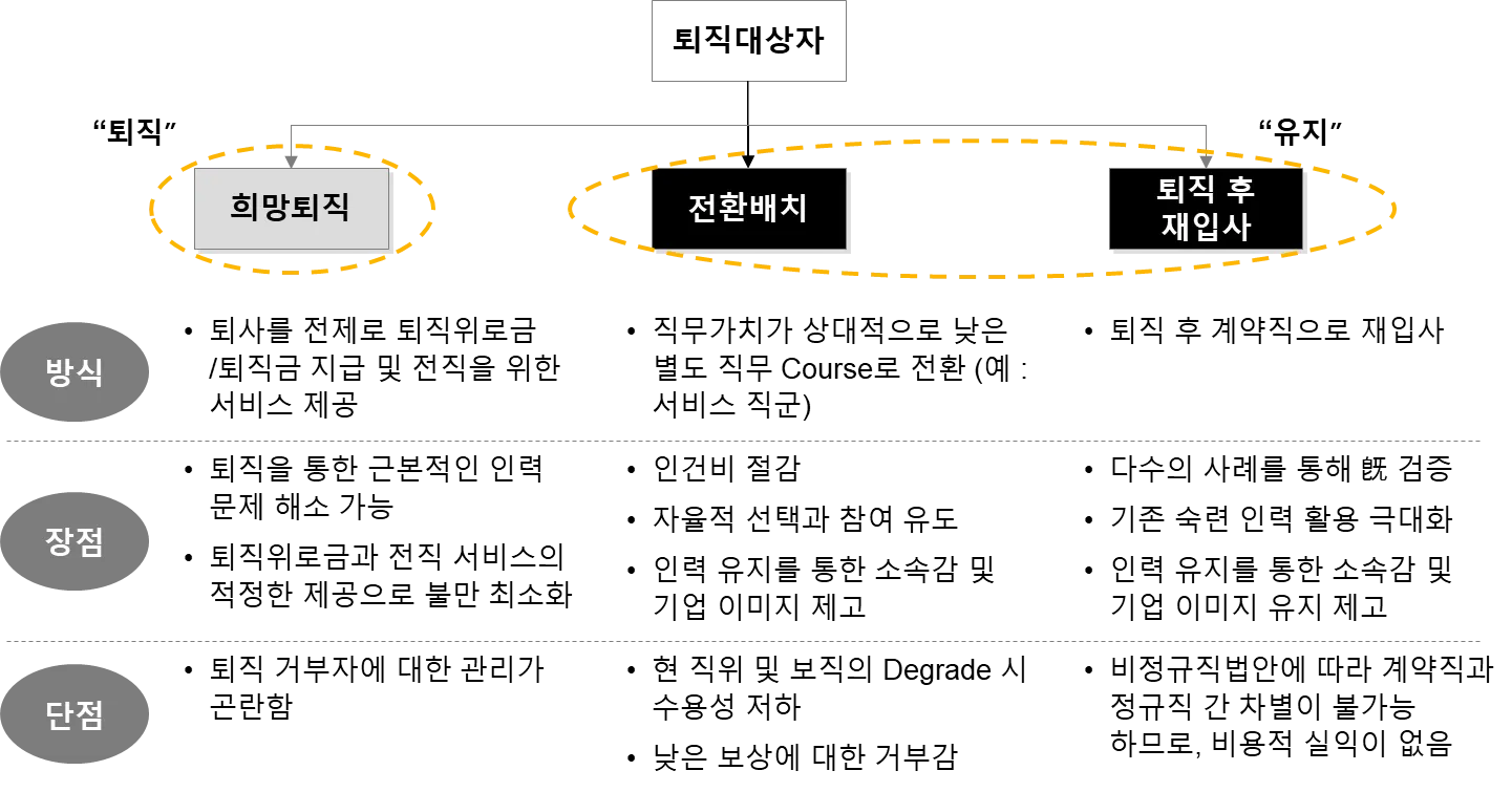 인력을 퇴직시키지 않고 유지하는 방안으로서, 퇴직대상자에 대한 별도 비핵심 직무로의 전환배치 및 퇴직 후 재입사 방식을 활용할 수 있음