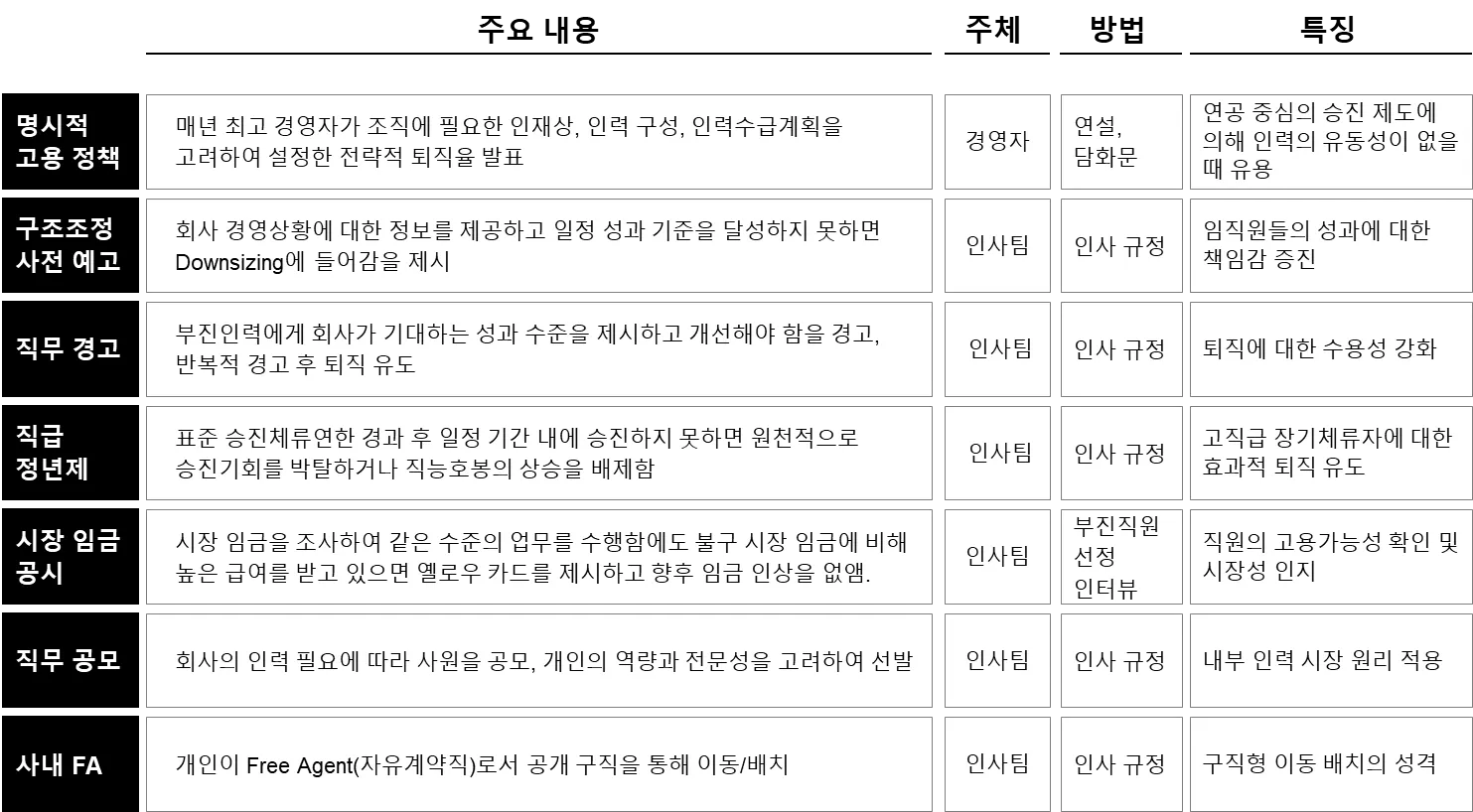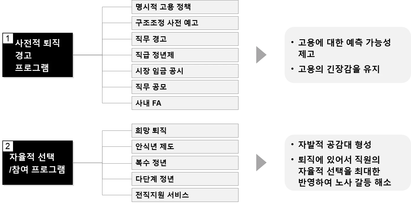 임시방편적, 인위적, 대규모 인력구조 개선의 부정적 효과를 최소화하면서 기업 경쟁력을 제고하고 위해서는 종업원의 수용성을 높일 수 있는 전략적 퇴직관리가 요구됨