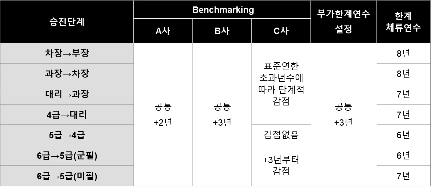 현재 조직의 평균 체류연수/승진연한을 고려하고 타 사 사례를 검토하여 조직의 직급정년제도 도입에 필요한 세부 사항을 정의함