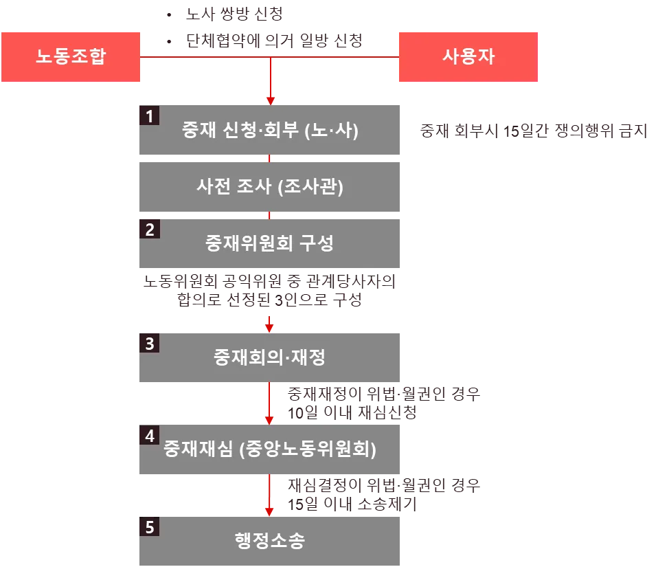노동쟁의에 대하여 노동관계 당사자 쌍방 또는 단체협약에 의해 일방이 노동위원회에 신청하여 노동위원회의 처분(중재재정)에 따라 노동쟁의를 해결하는 조정절차