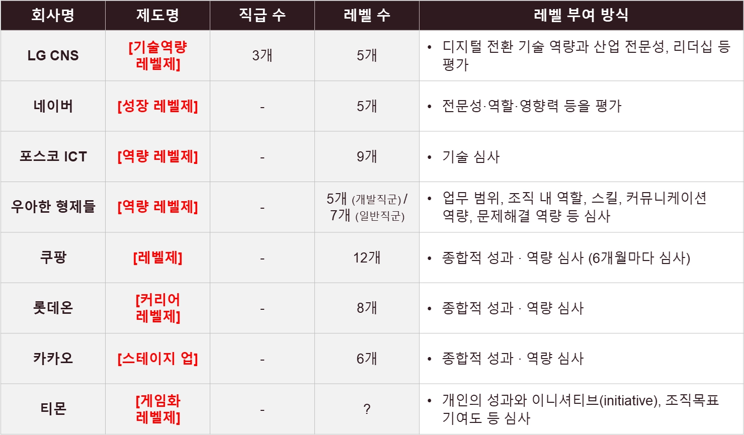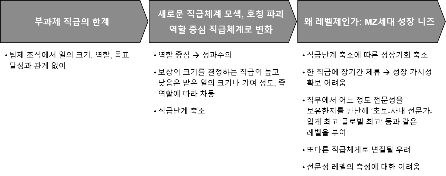 최근 IT기업을 중심으로 직급체계를 폐지하고, 고전적 개념의 직급 대신 기술 역량을 평가하여 ‘(역량) 레벨’을 부여하는 레벨제 운영 사례가 다수 보이고 있습니다.