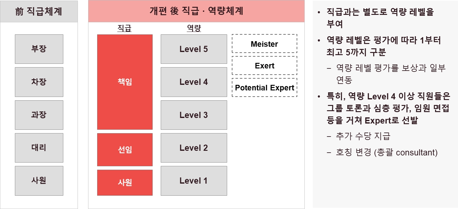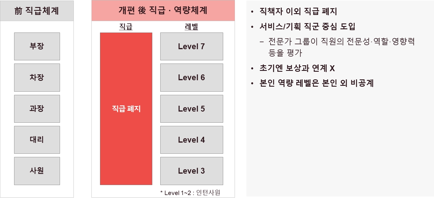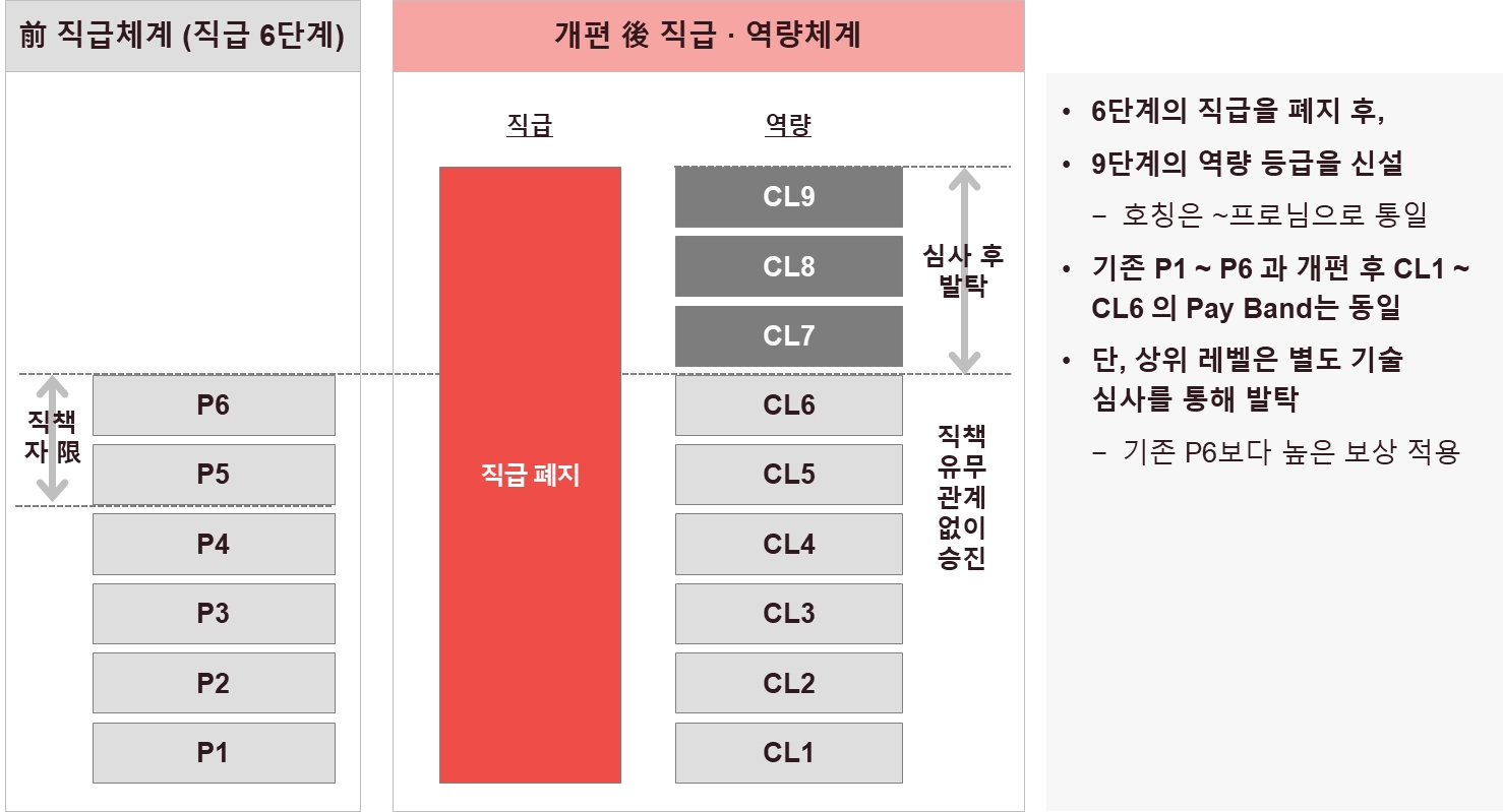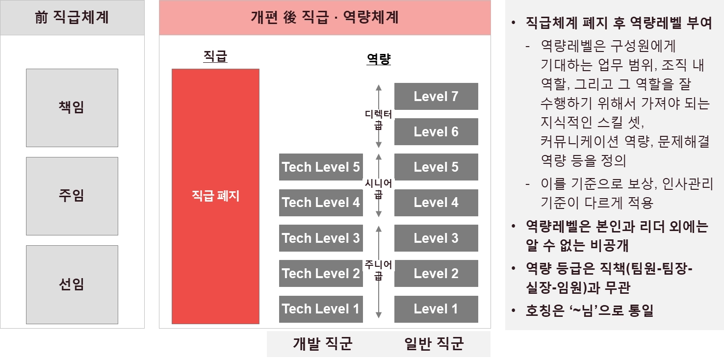 포스코 ICT와 우아한 형제들은 직급 폐지 후, 역량 등급을 신설하였습니다.
