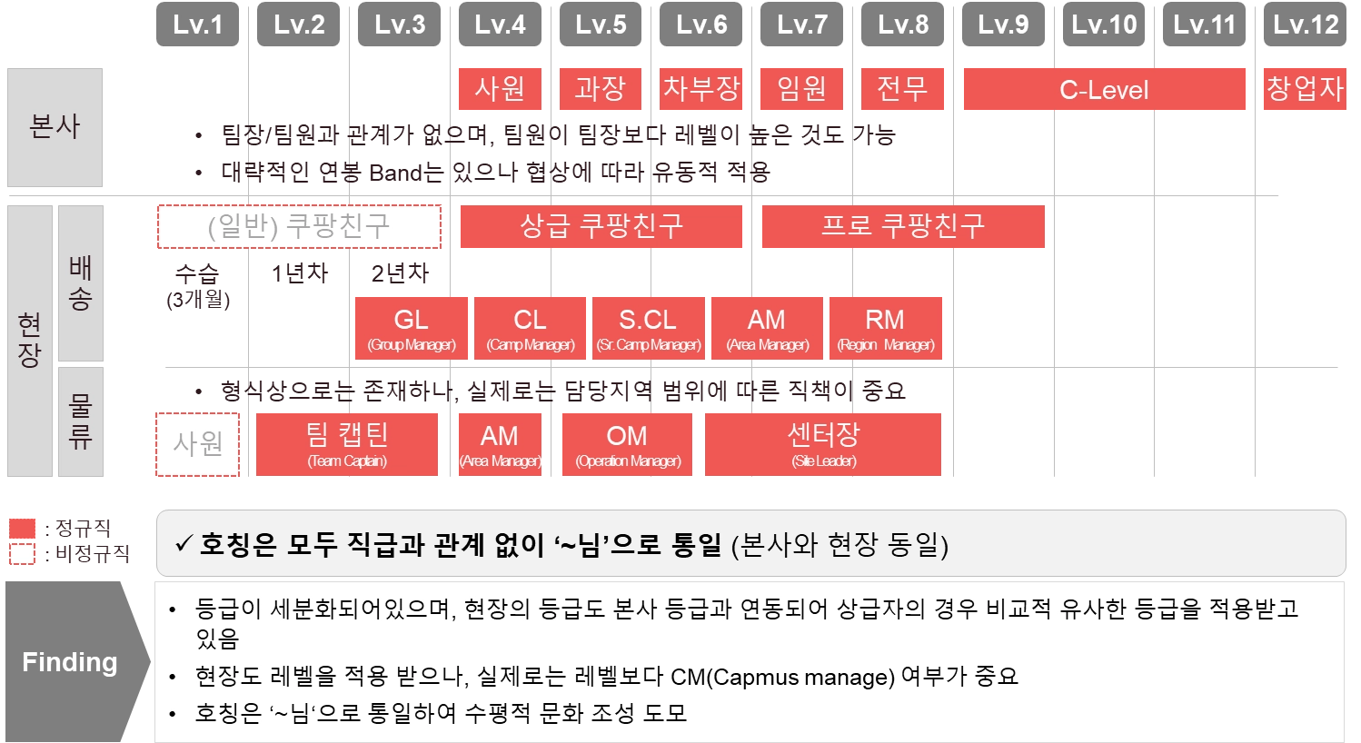 쿠팡은 2015년부터 닉네임 제도를 도입하며 직위를 폐지 후 레벨 제도를 운영하고 있습니다.