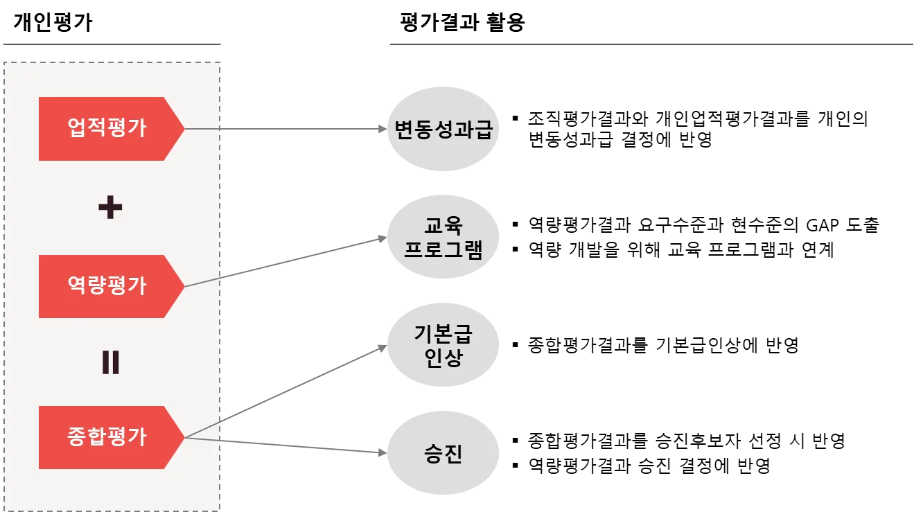 업적평가 결과는 변동성과급에 연계, 역량평가는 교육을 통한 역량의 개발, 종합평가결과는 기본급의 인상과 동시에 승진 후보자 선정에 반영함으로써 평가를 통한 동기 부여 효과를 제고합니다.