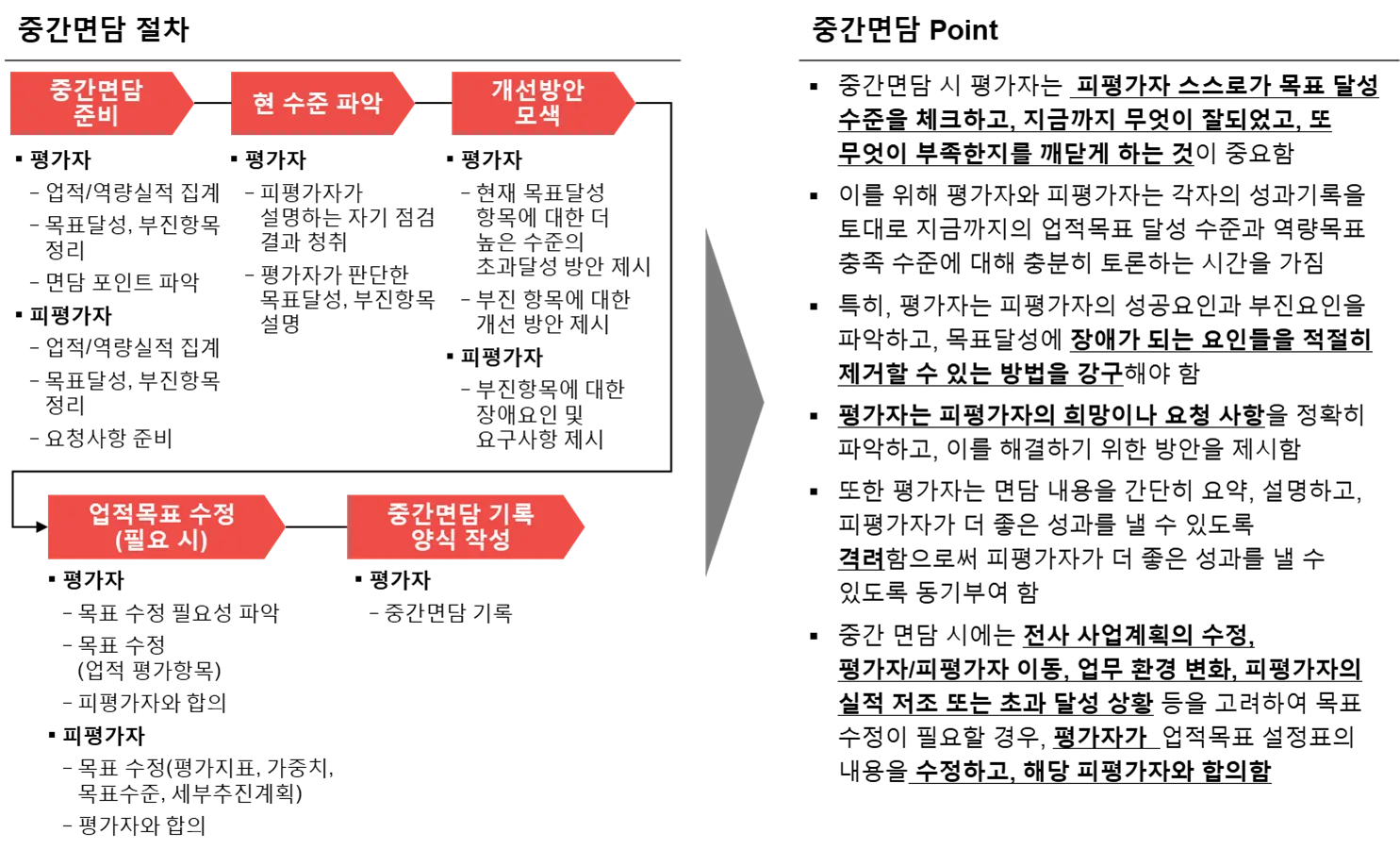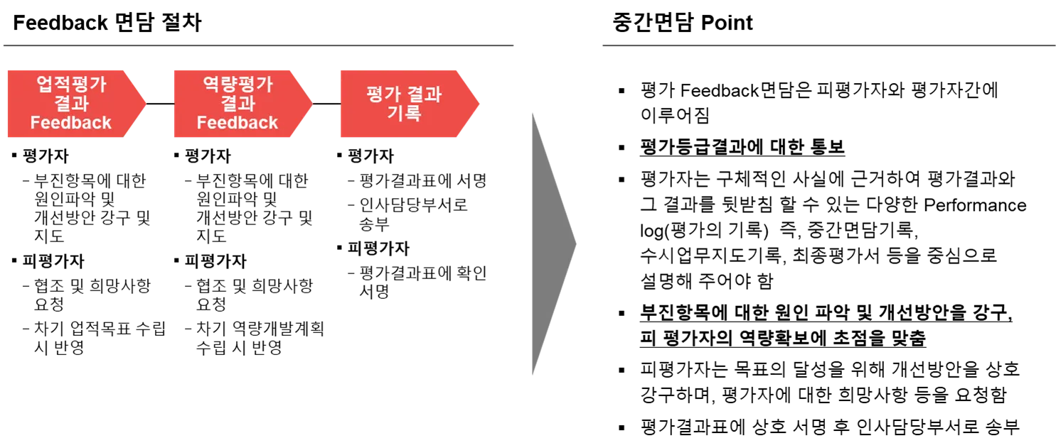 업적 및 역량 중간 면담을 통해 계획 대비 진척도 등을 점검하고, 목표달성에 장애가 되는 요인을 제거하는 방안을 강구합니다.