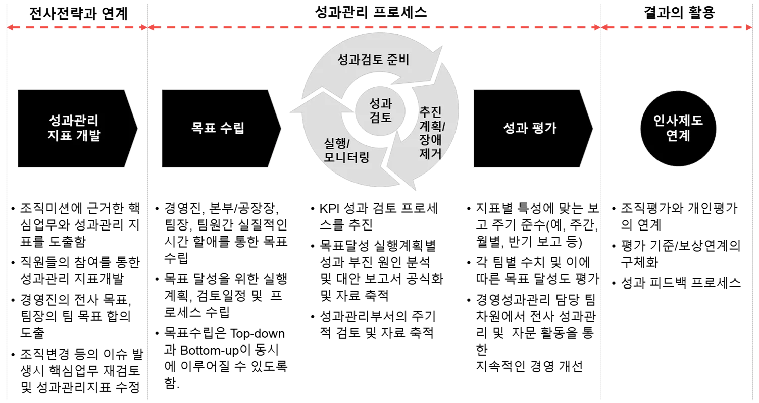 조직의 경영목표를 효과적으로 달성하기 위해서는 성과관리 지표 및 프로세스가 각 단계별로 명확히 이루어지도록 하고, 인사제도와의 연계성을 확보하는 것이 중요합니다.