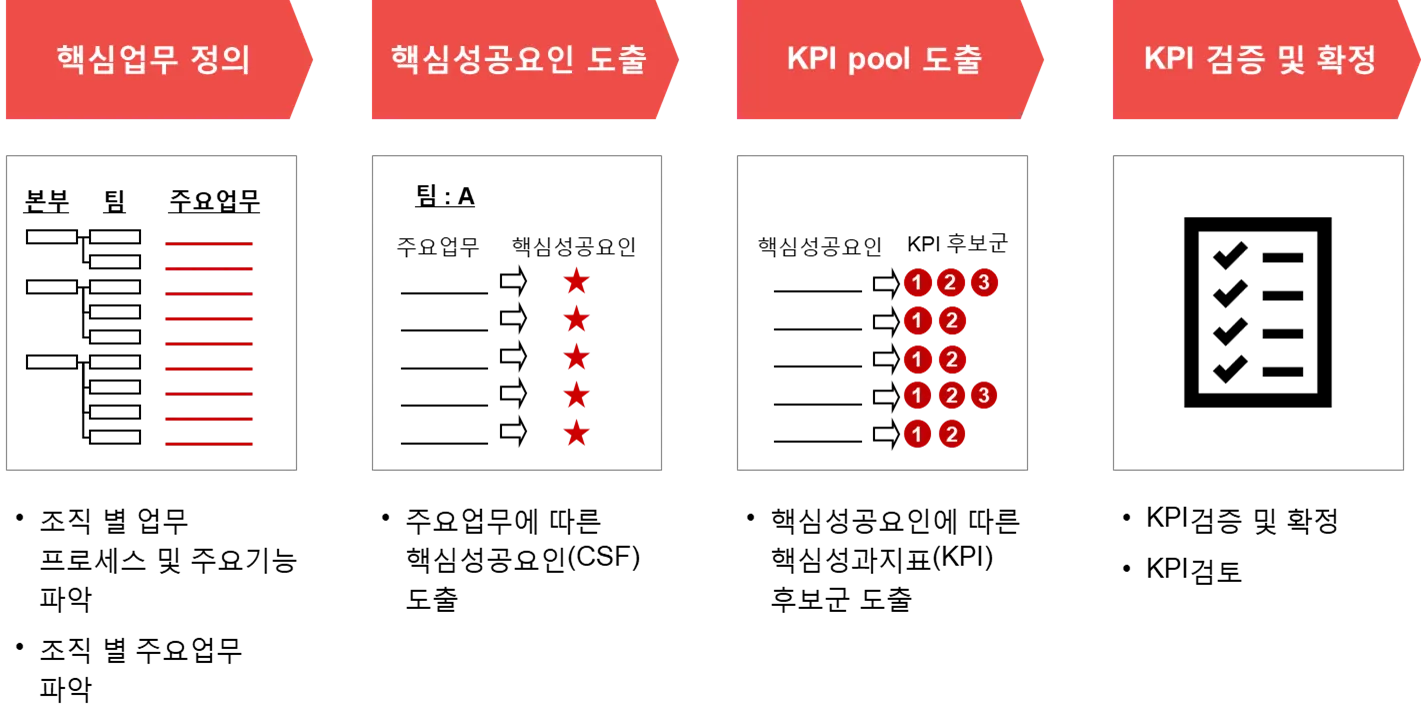 KPI(Key Performance Indicators) 도출 방식은 Top to the Bottom과 Bottom to the Top 방식을 활용합니다.