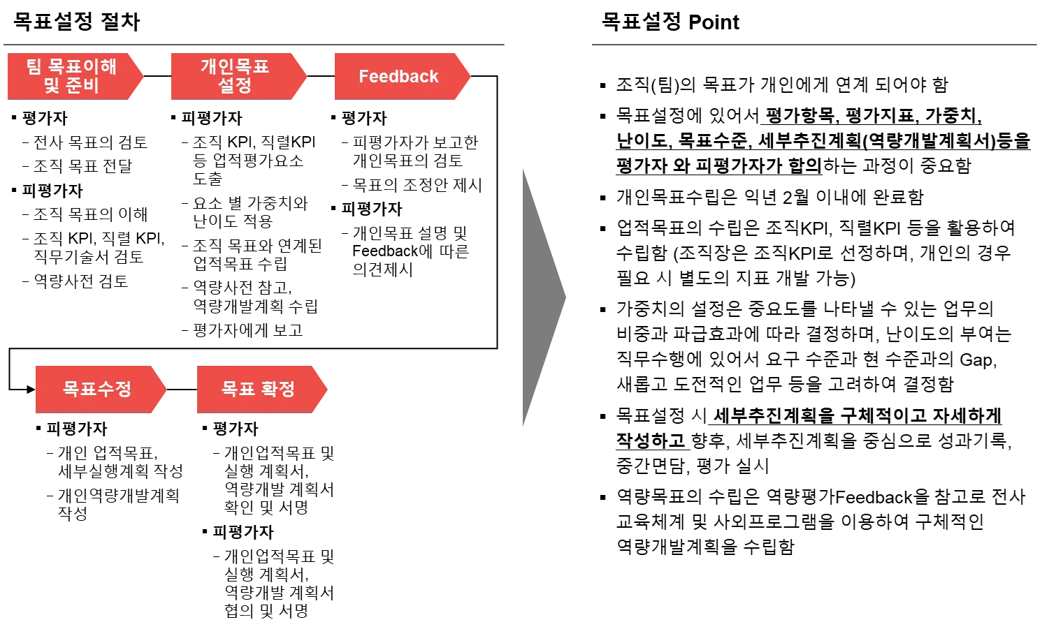 개인의 목표는 조직(팀) 목표와 연계되어야 하며, 평가자와 피평가자 간의 충분한 합의를 통하여 구체적으로 수립되어야 합니다.