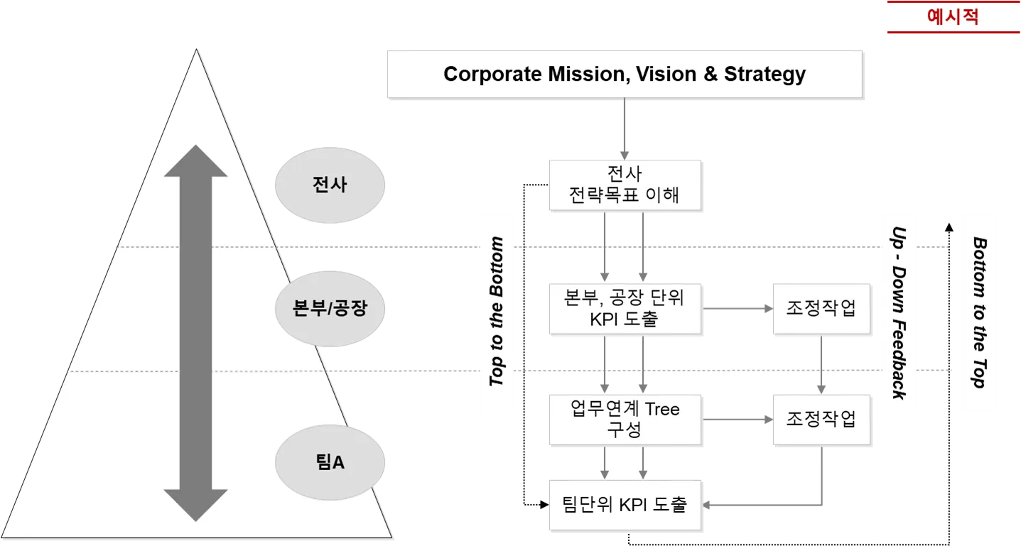 Top to the Bottom 방식은 사업전략 및 목표로부터 연계되어 상위조직에서 개인까지 연계되는 방식입니다.