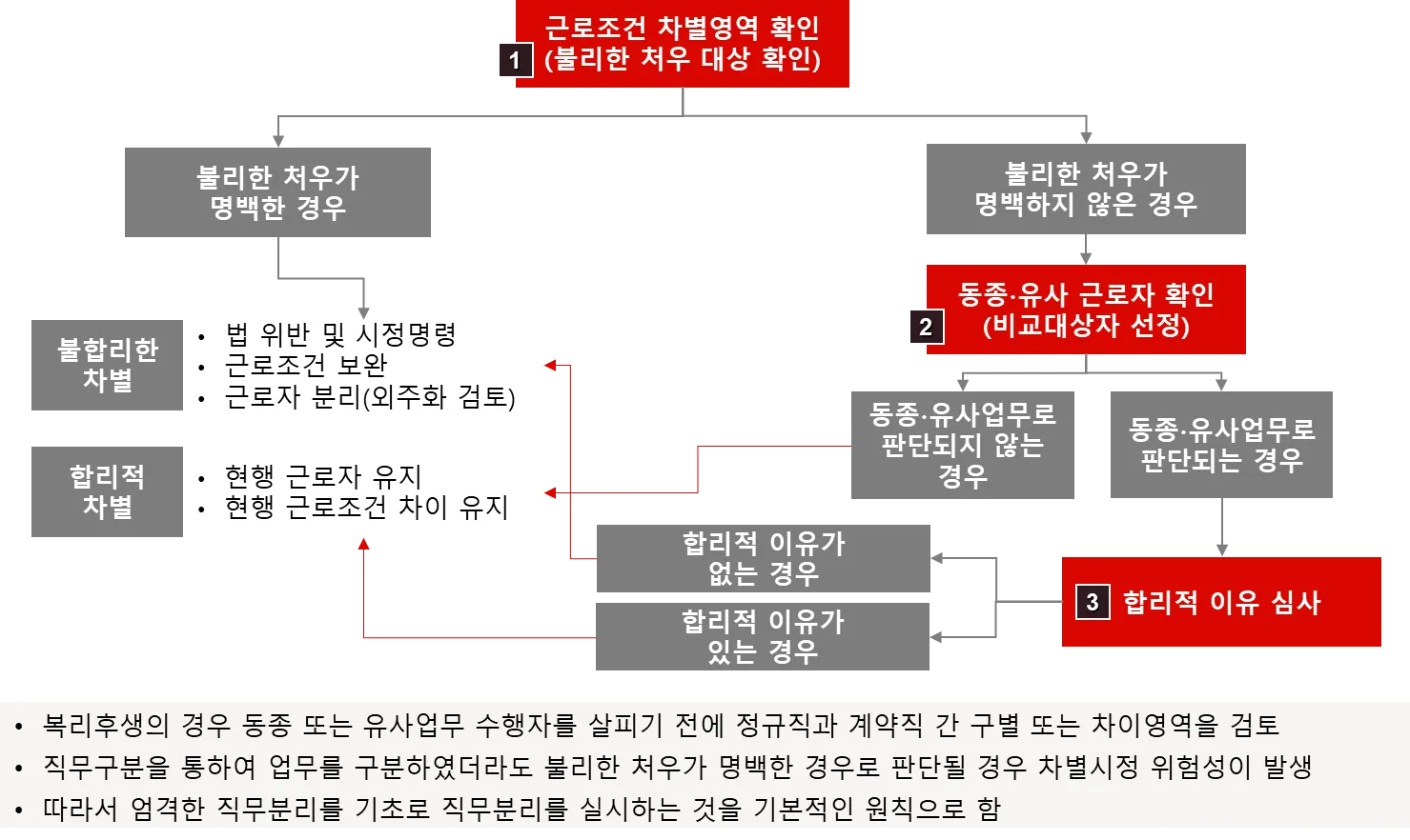 단, 업무의 내용과 별개로 일률 지급되는 복리후생적 금품 및 실비변상적 금품은 합리적 이유가 부정됨 (가족수당, 명절상여금, 가정의 달 행사비, 피복비 등)