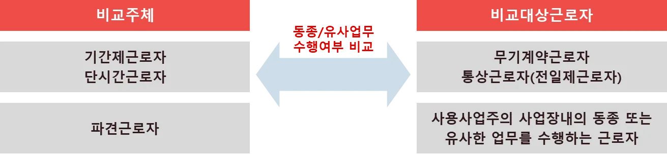 ②비교대상 근로자가 있을 것 | ‘비교대상 근로자’란, 비정규직 근로자와 동종 또는 유사한 업무에 해당하는 근로자를 의미