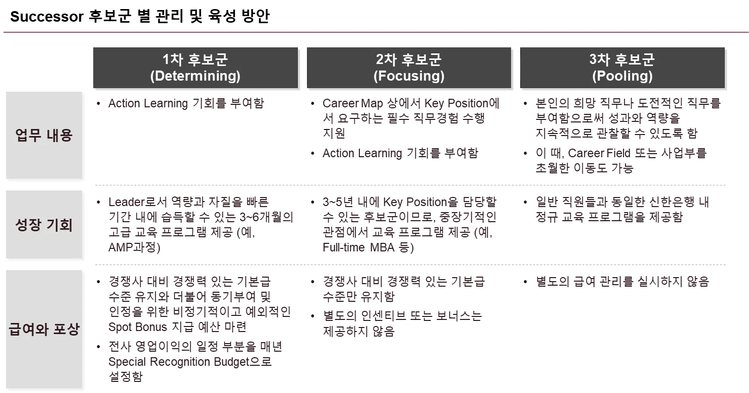 향후 Talent Portfolio 운영의 발전기에서는 조직의 변화를 주도할 핵심인재그룹으로서 Leader Talent의 선발 요건과 육성 방안에 대한 설정이 필요 합니다.
