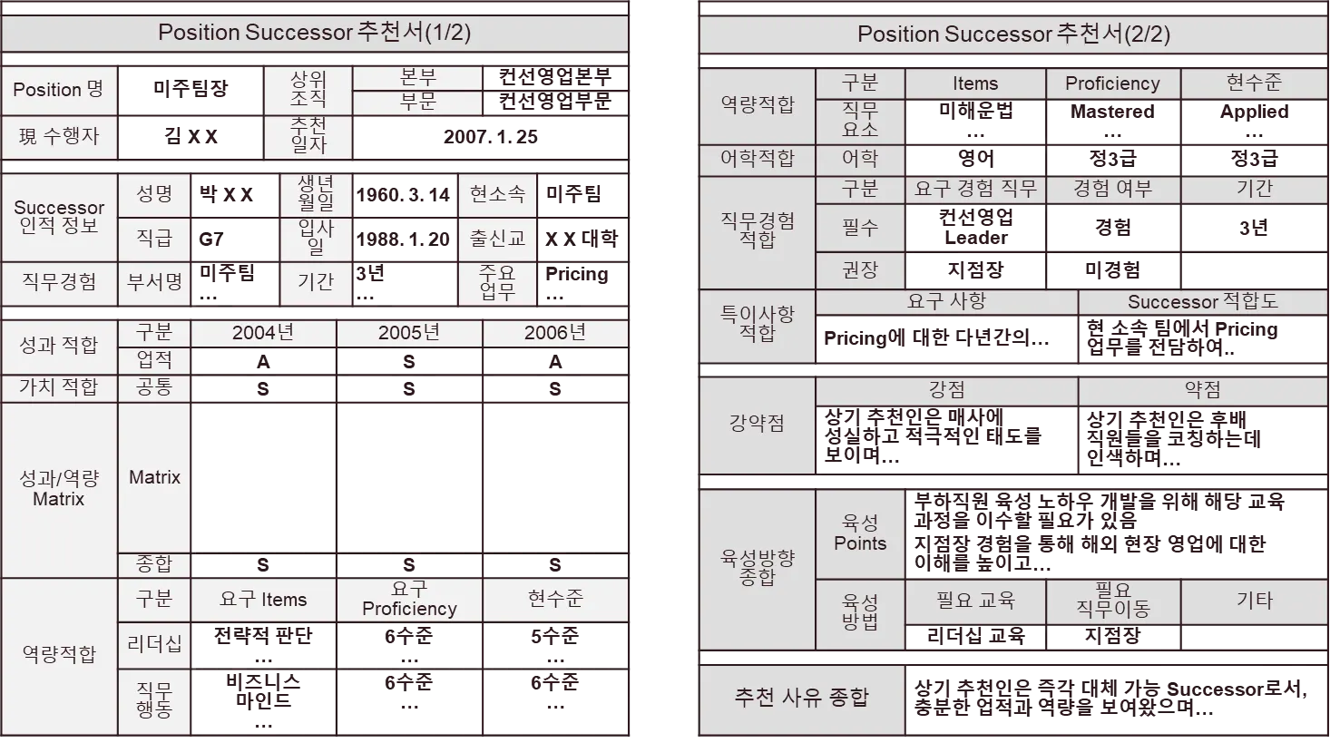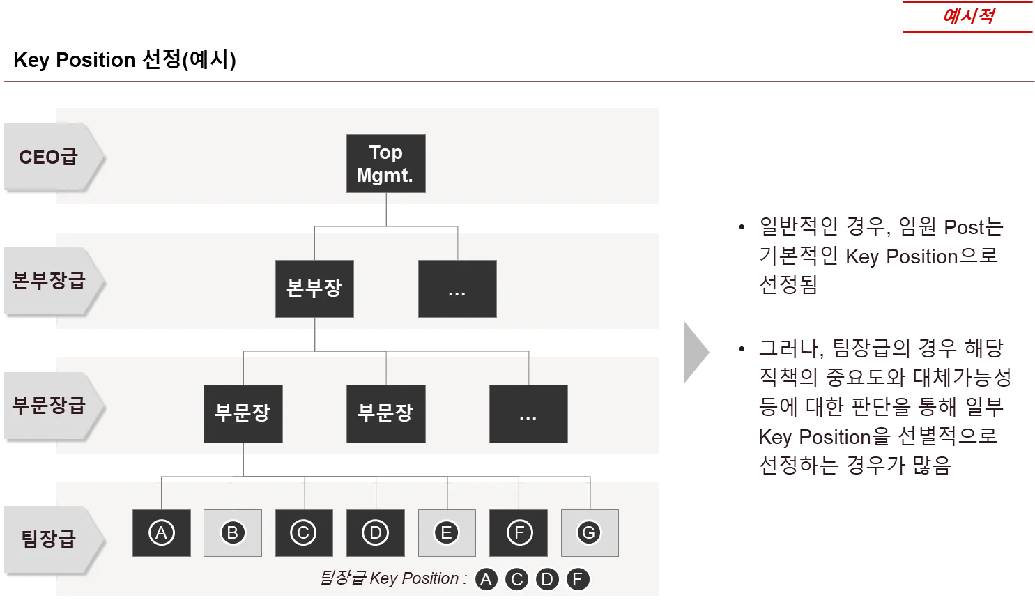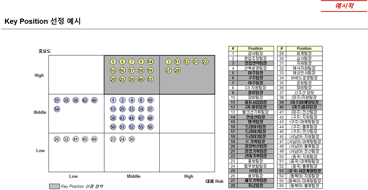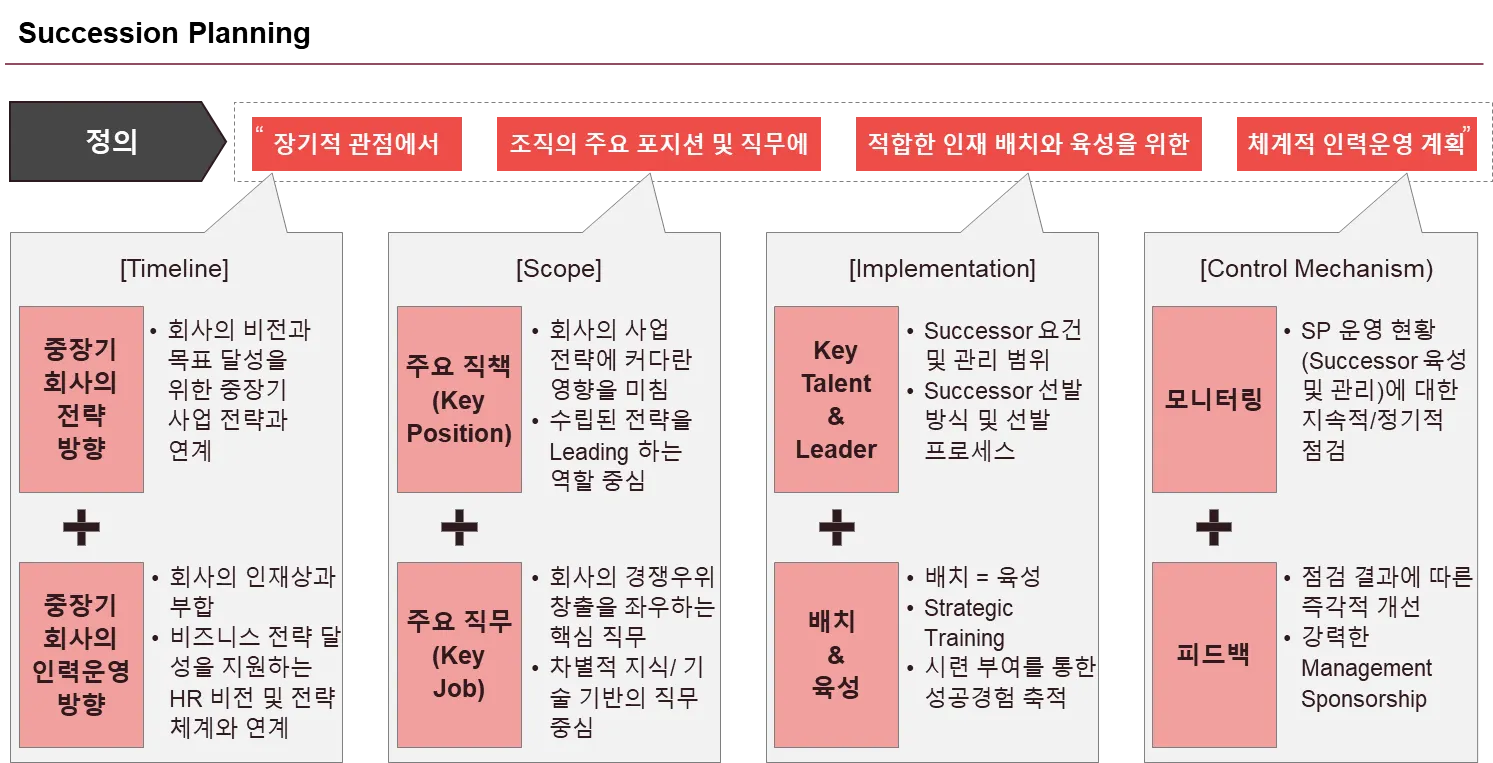 Succession Planning이란 Key Position에 적합한 인재 배치 및 육성을 위한 체계적 인력운영 계획 입니다.