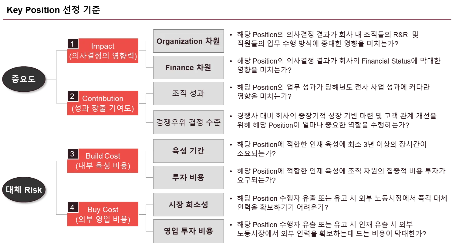 핵심인재 선정 기준은 중요도와 대체 리스크에 따라 선정하며, 각 선정기준마다 고려사항은 다음과 같습니다.