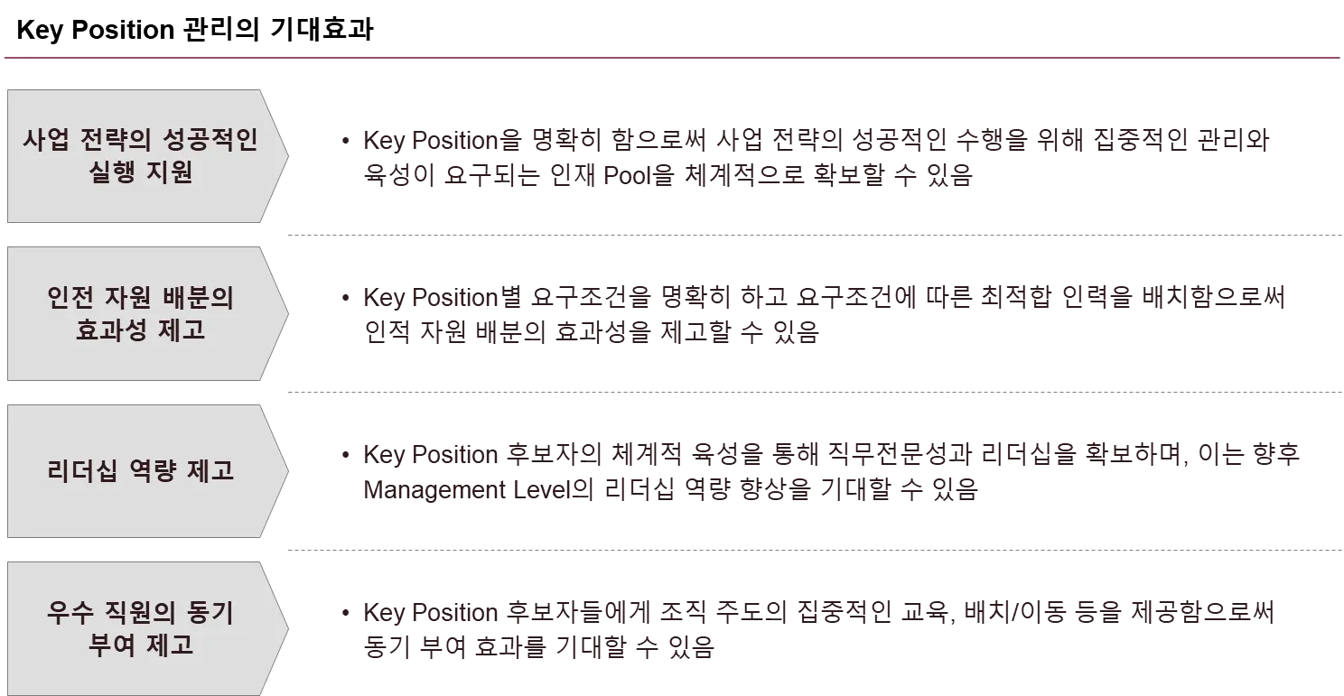 Key Position 관리 기대효과는 사업 실행 지원, 효과성 제고, 역량 제고, 동기부여 제고 등이 있습니다.