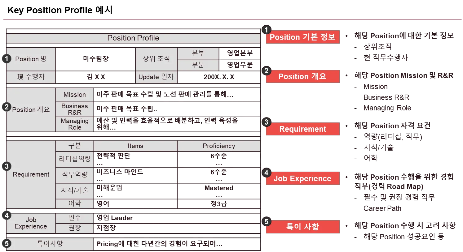 Key Position Profile – Key Position의 개요, 경력 요건 및 역량 요소 등의 정보를 기재하여 관리합니다.