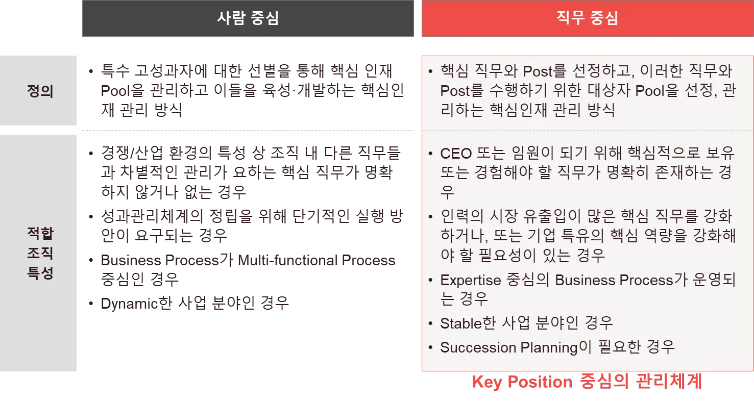핵심인재 관리방식은 사람중심과 직무중심의 관리방식이 있으며 각 정의 및 특성은 다음과 같습니다.