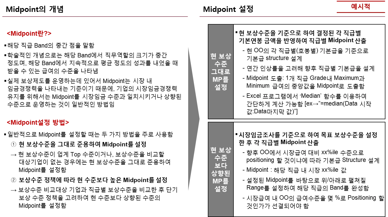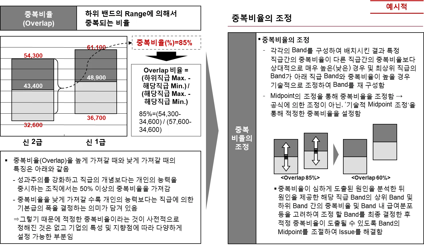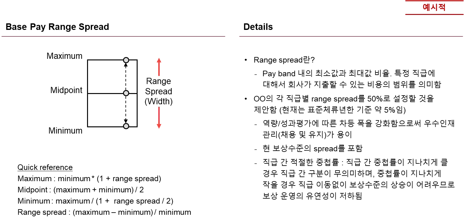 직급별 기본급의 Reference point를 정하고 현 기본급 범위 및 Pay band 간 중첩률을 고려하여 Range spread를 설계 합니다.