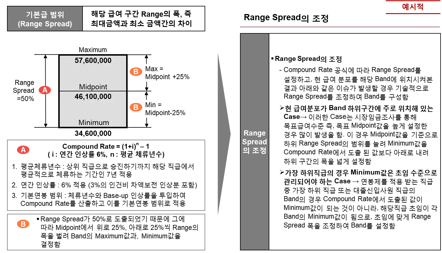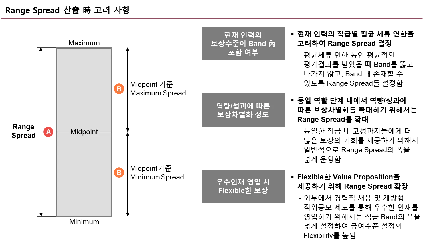 Range Spread는 직급별 승진기준연한에 따른 기본급 상승 범위 및 Pay band 간의 중첩률을 고려하여 직급별로 차등 설정 합니다.