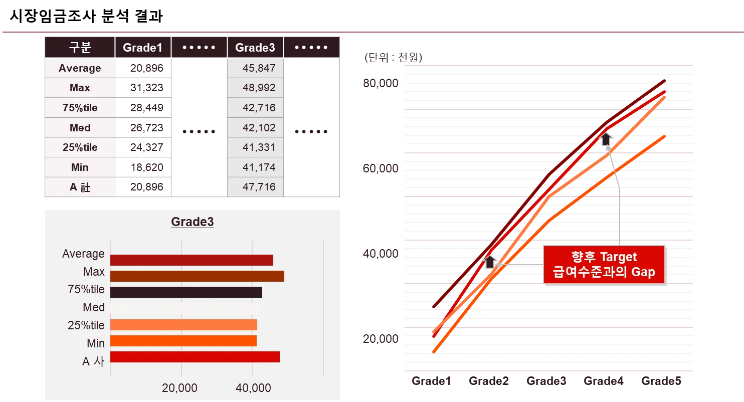 시장임금조사는 기본급(Base Pay) 설계 시 필수 작업으로서 회사 급여수준의 시장 내 위치를 확인하고 경쟁력 있는 목표 수준을 설정하기 위한 것으로, 시장임금조사 분석결과는 향후 급여 경쟁력을 확보하기 위해 필요한 Target 임금수준의 결정에 사용 됩니다.