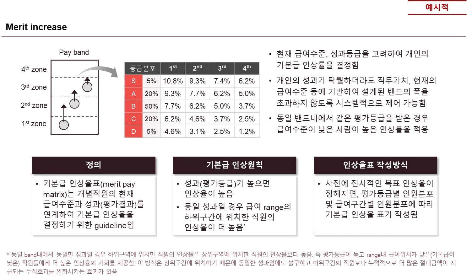 기본급 인상방안(merit pay system)은 개인의 평가결과에 따라 인상율을 차등하게 되며, 급여 구간 내에서의 위치에 따라서도 인상율이 차등 적용 됩니다.