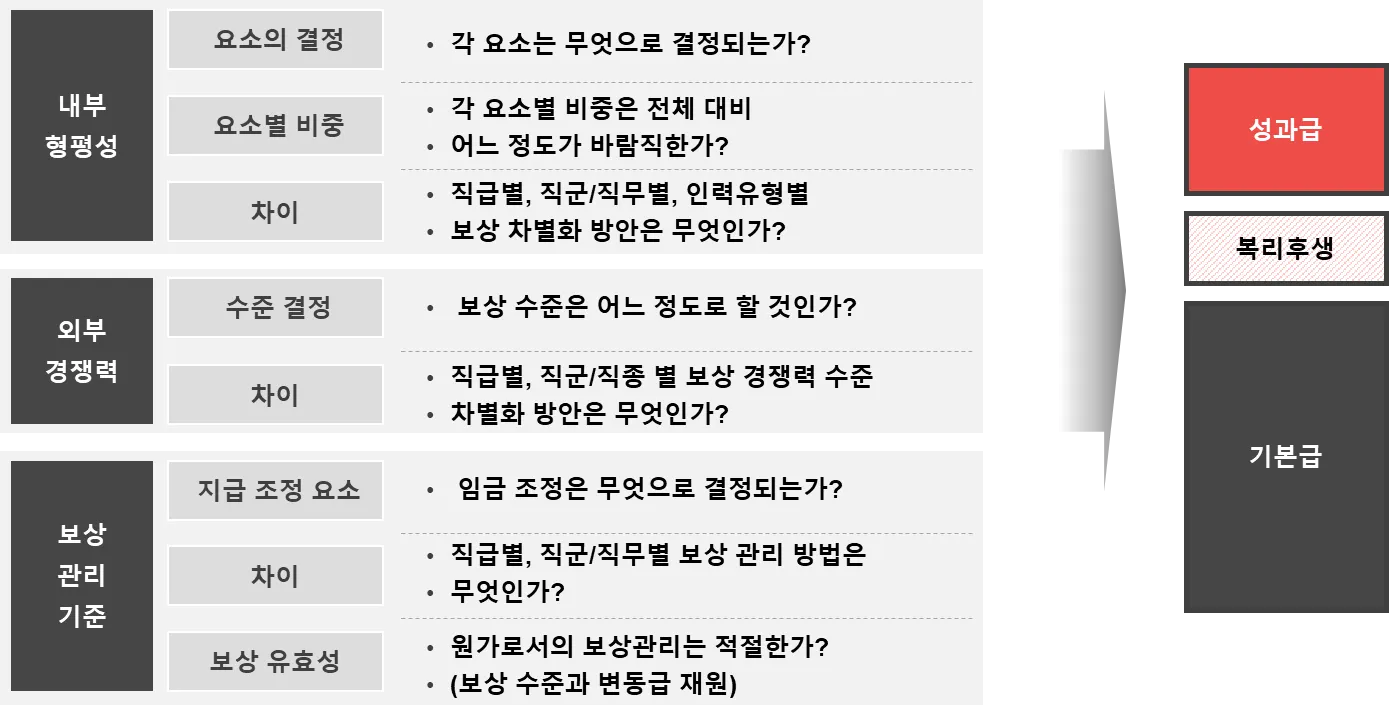 Pay band 설계는 회사의 정책 및 현실에 따라서 아래와 같은 요소들을 고려하여 모든 요소들이 유기적인 관계를 가지고 설계되어야 합니다.