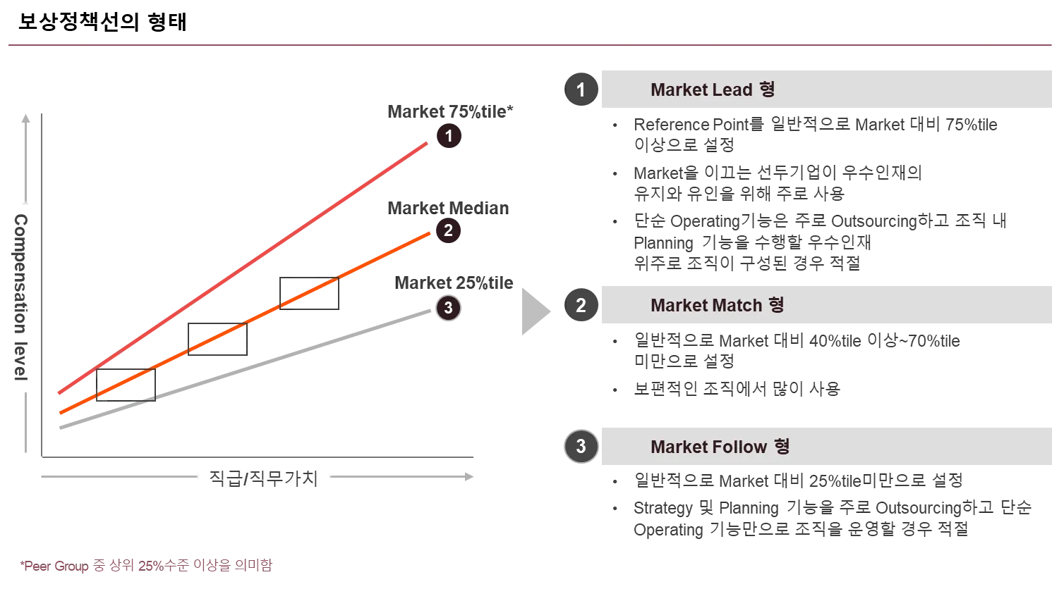 보상 정책선은 직원 급여수준의 Market 대비 보상 경쟁력을 의미하며, Pay Band 설정 시 우선적으로 고려되야 합니다.