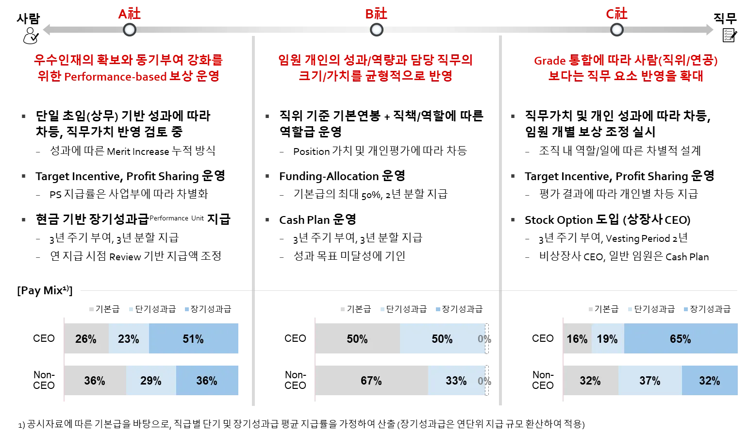 주요 대기업의 보상제도는 기업 특성 및 보상 정책에 따라 강조하고 있는 요소(사람/일)가 다르며, 대부분 CEO의 변동급 비중을 타 임원 대비 높게 설정