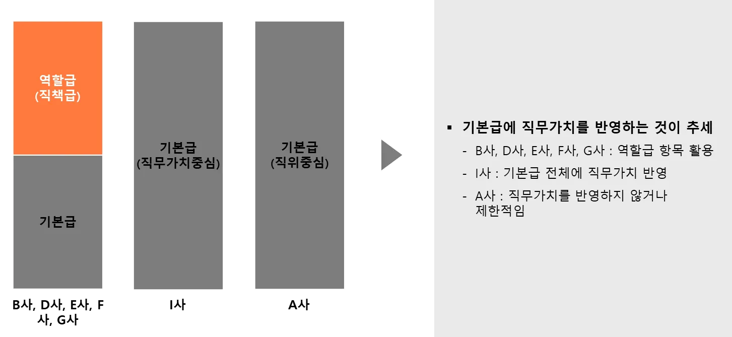 주요 그룹사 Base Pay 구조는 크게 ‘기본급’과 ‘기본급 + 역할급’으로 구분할 수 있으며, 기본급에 직무가치를 반영하는 것이 추세