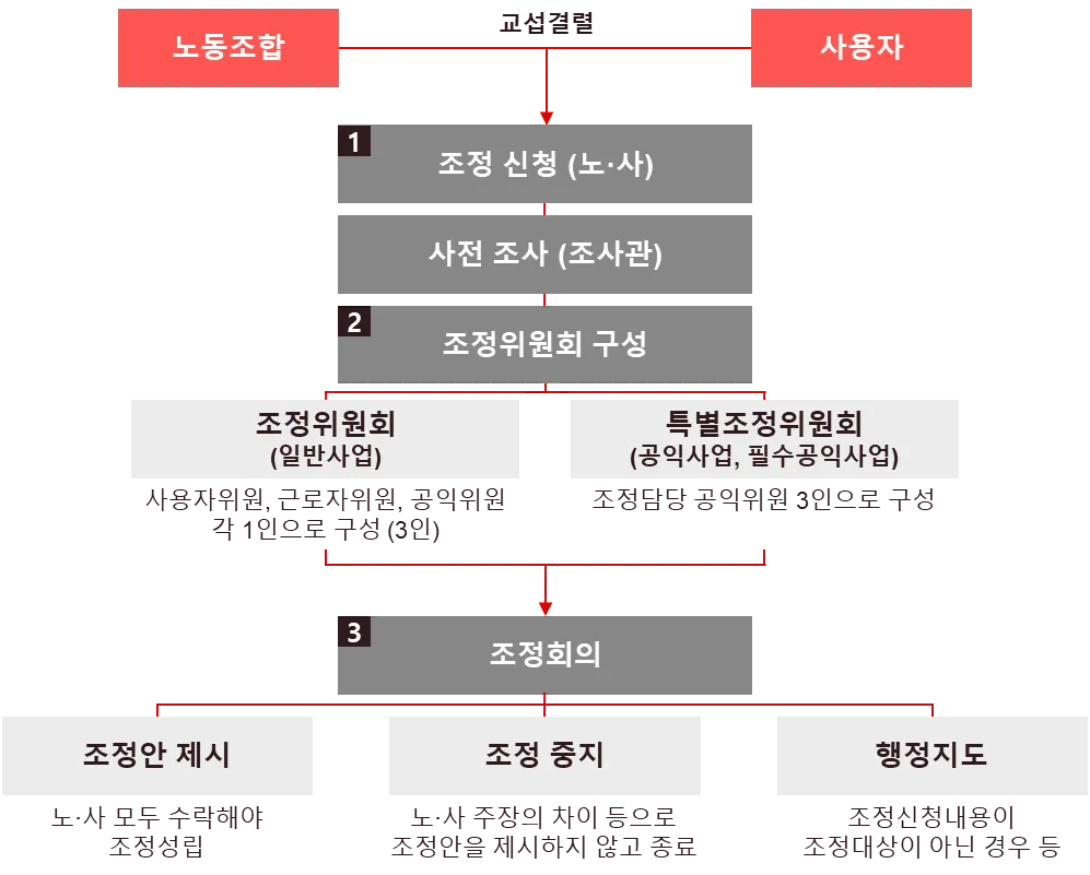 근로자·사용자·공익위원 3인(각 1인)으로 조정위원회 구성 (조정기간 10일 이내, 당사자간 합의로 연장가능)