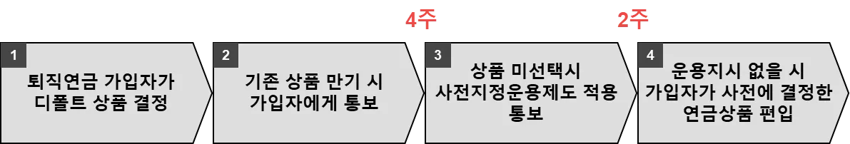 근로자가 본인의 퇴직연금 적립금을 운용할 금융상품을 결정하지 않을 경우, 사전에 정해둔 운용방법으로 적립금이 자동 운용되도록 하는 제도