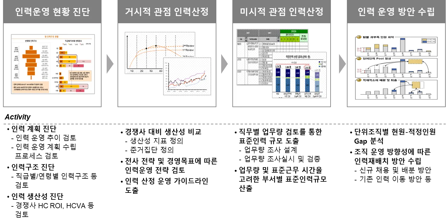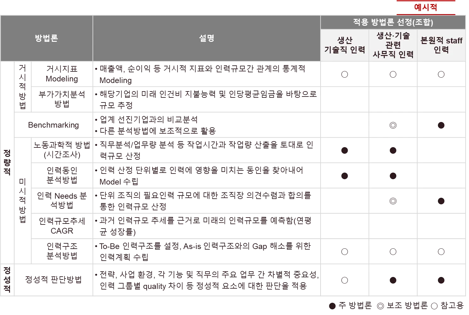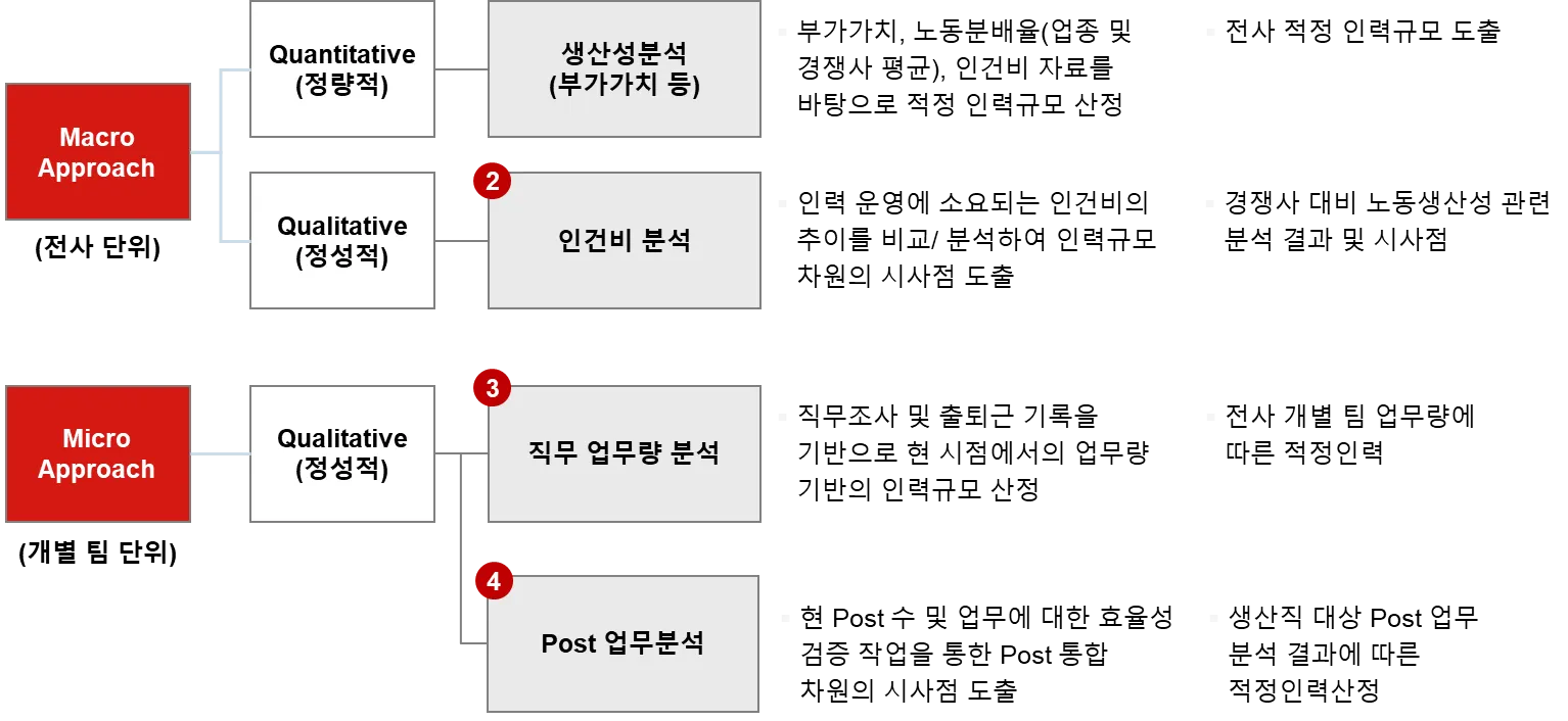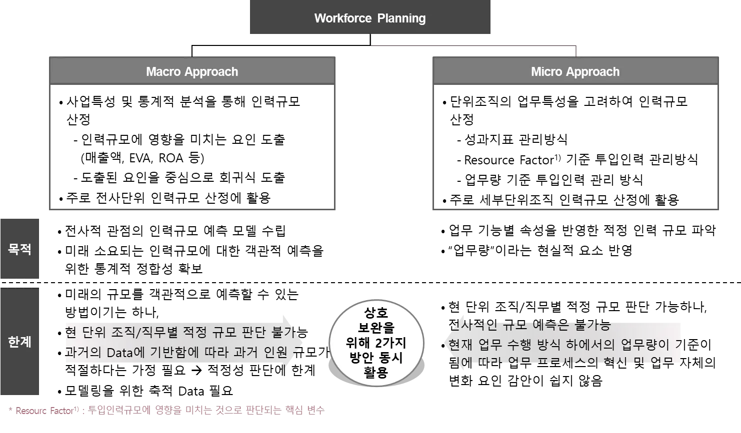 적정인력 산정 방법론은 거시적 관점(Macro Approach)과 미시적 관점(Micro Approach)이 있으며, 산업 및 기관 특성, 부서별 특성 등에 따라 각기 다른 방법으로 적정인력을 도출해야 합니다.