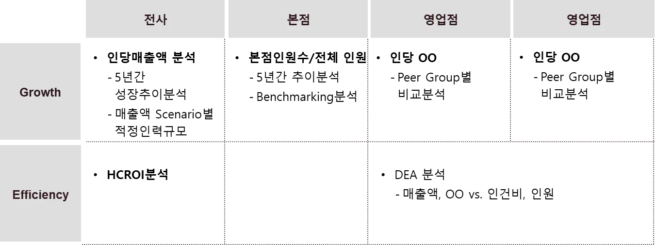 B사는 전사단위는 생산성분석과 인건비 분석, 개별 팀 단위는 업무량과 Post업무 분석을 통해 인력을 산출하였습니다.