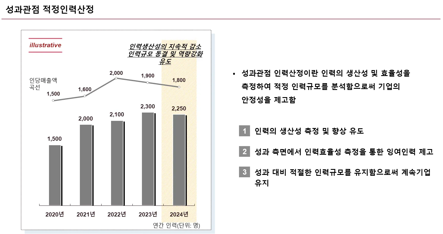 성과관점 적정인력산정은 인력의 생산성 및 효율성의 측정을 통해 적절한 인력규모를 유지함으로써 계속 기업을 유도 합니다.