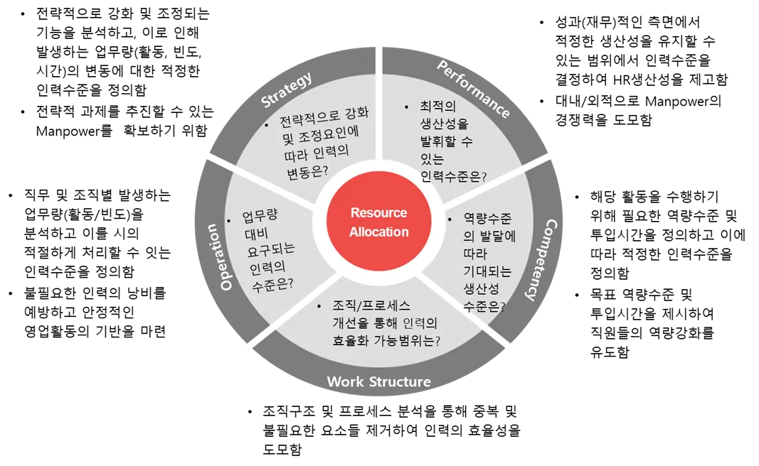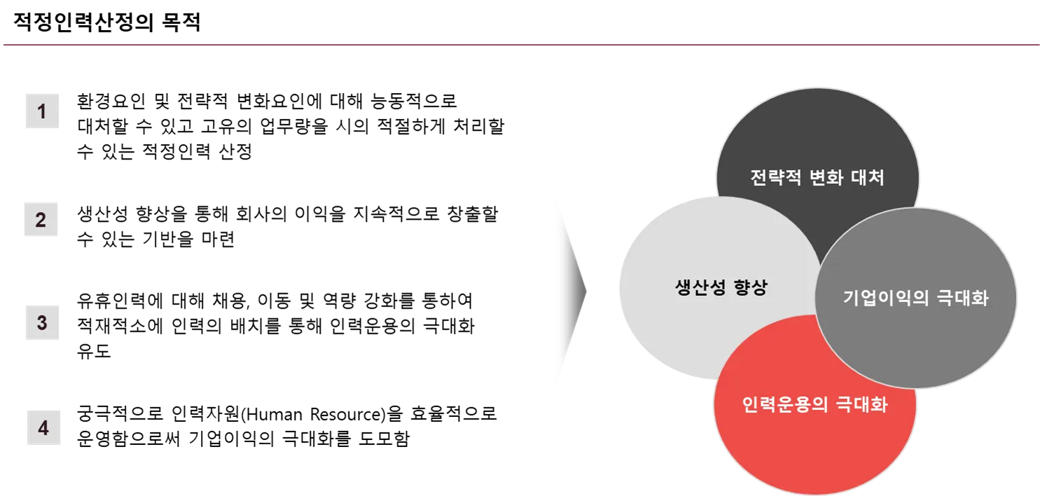 현재 조직 상에서 업무를 원활하게 수행하고 생산성의 질적 저하를 초래하지 않는 인원 수를 산정하여 효율적인 조직운영을 목적으로 합니다.