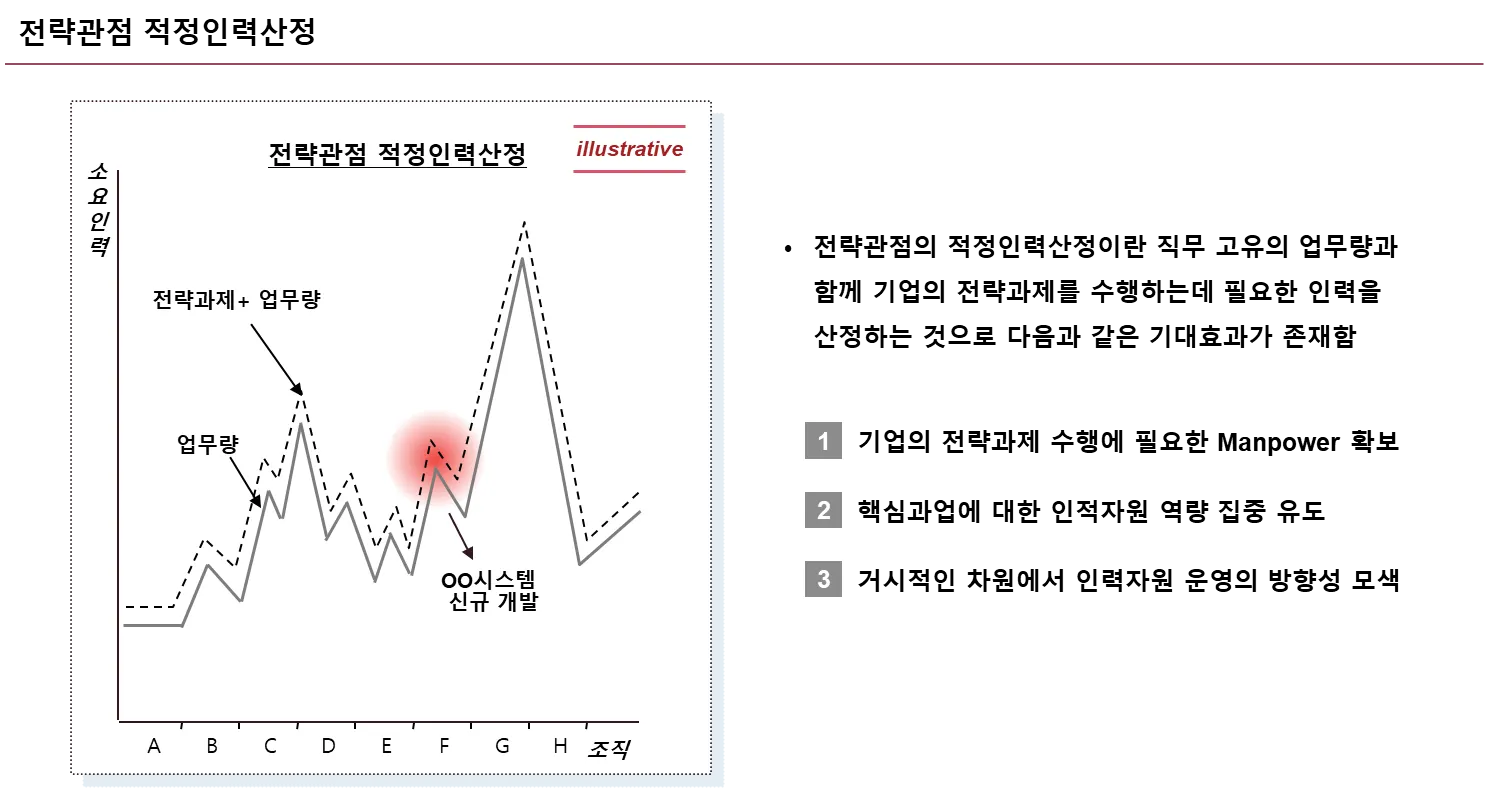전략관점의 적정인력산정은 기업의 전략과제 수행에 필요한 인력을 산정하고, 핵심과업 중심의 인력배치를 통해 성공적인 경영목표 달성의 기반을 마련하는 활동 입니다.