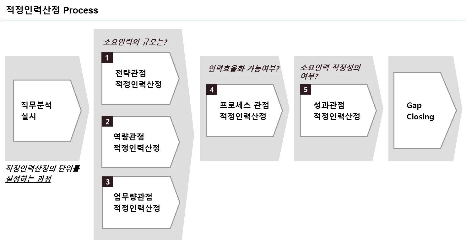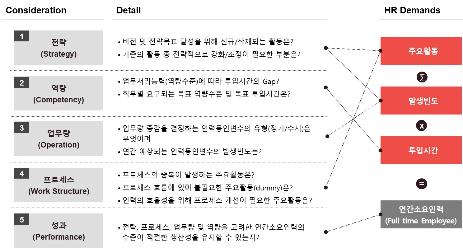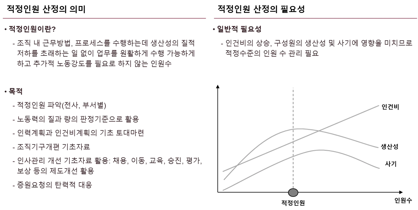 - 단기 적정인원(성과관점, 업무량 관점, 역량관점)과 중장기 적정인원(전략관점, 프로세스 관점)