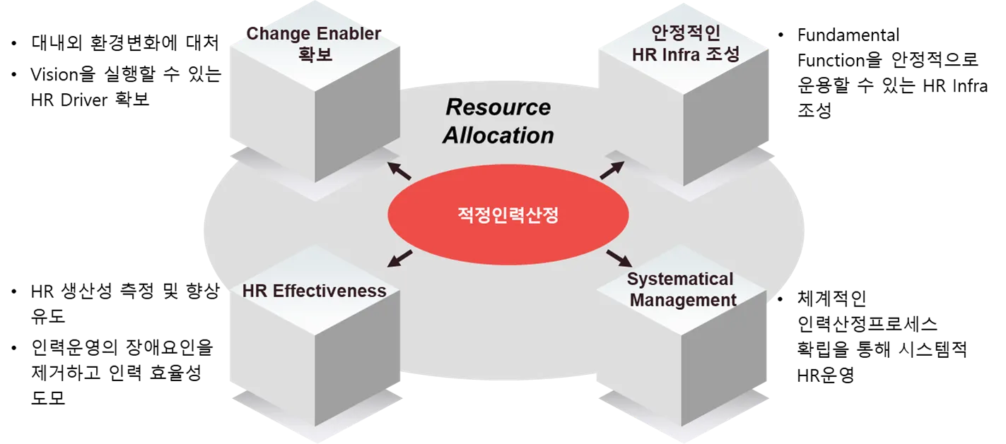적정인력산정을 통해 직무의 안정적인 운영을 도모할 수 있는 HR Infra를 확보하고, 이와 함께 인력운영의 비효율적인 부분을 제거하고, 시스템적 적정인력산정 프로세스를 확립합니다.