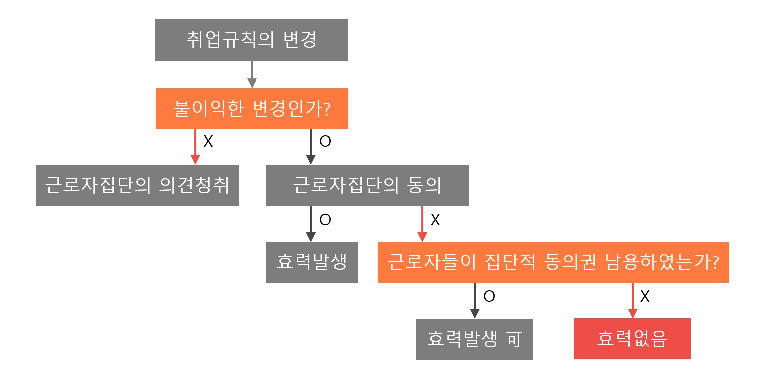 But, 최근 대법원 전원합의체 판결을 통해 "근로자 과반의 동의를 받지 않은 불리한 취업규칙의 변경은 원칙적으로 금지된다"고 하며 사회통념상 합리성 법리를 폐기
