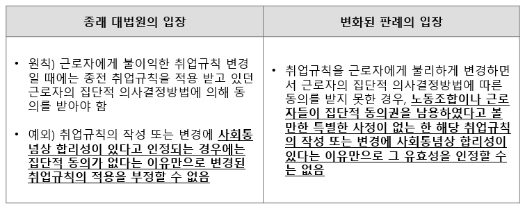 지금까지 대법원은 취업규칙을 근로자에게 불이익하게 변경하면서 동의를 받지 않은 경우라도 '사회통념상 합리성'이 있다면 예외적으로 변경된 취업규칙의 효력을 인정
