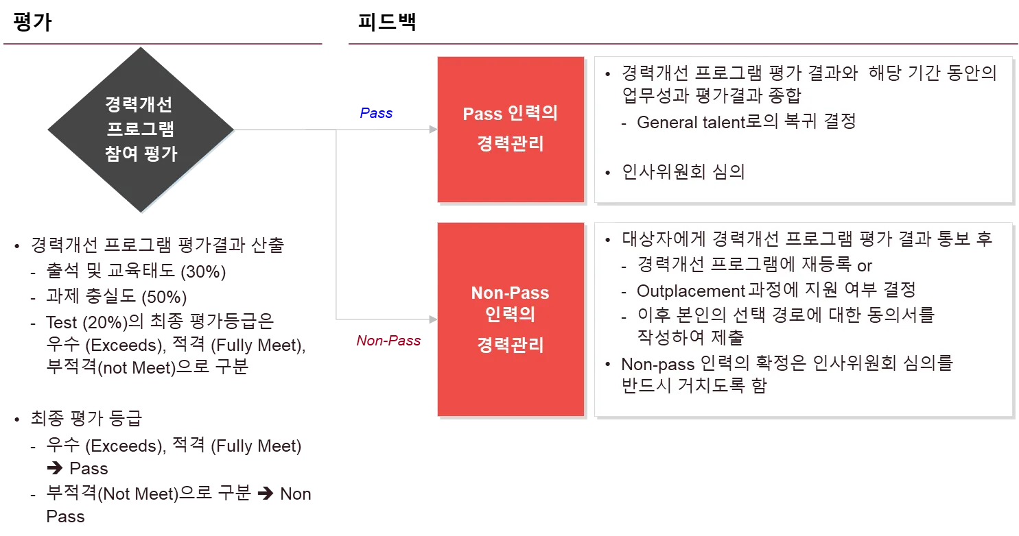 경력개선 프로그램에 참가한 결과에 따라 개인별 Pass 여부를 결정하고 이에 근거하여 지속적으로 인력관리가 이루어질 수 있도록 합니다.
